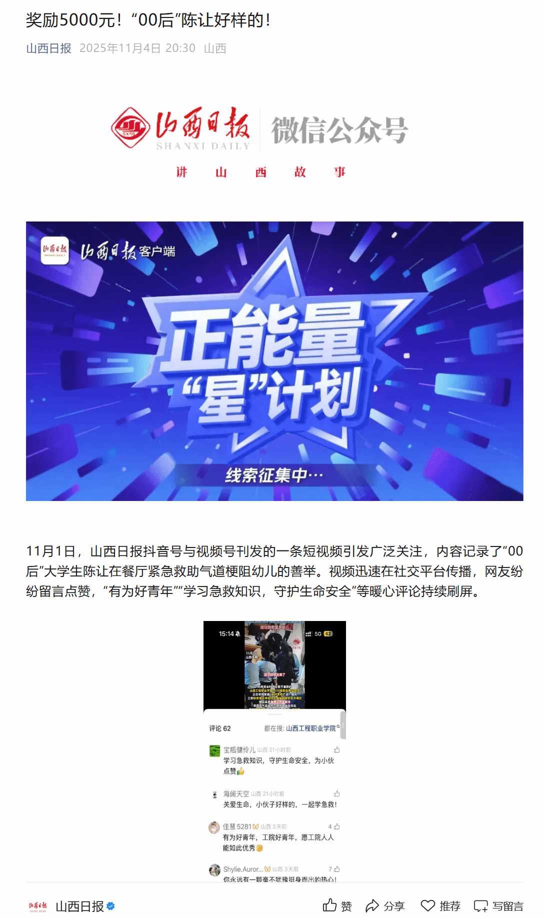 11月1日,山西日报抖音号与视频号刊发的一条短视频引发广泛关注,内容记录了“00后”大学生陈让在餐厅紧急救助气道梗阻幼儿的善举。视频迅速在社交平台传播,网友纷纷留言点赞,“有为好青年”“学习急救知识,守护生命安全”等暖心评论持续刷屏。