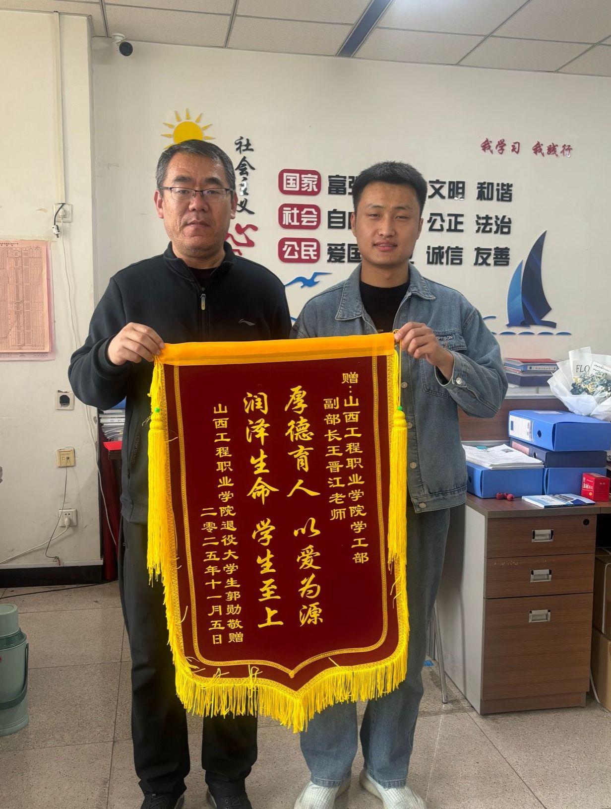 11月5日,我院教务部与学生工作部办公室迎来特殊访客——2025级新生郭勋。他手持锦旗,向老师们表达真挚谢意,这份心意既是对学院工作的肯定,更彰显了学院各部门协同服务的责任与温度。