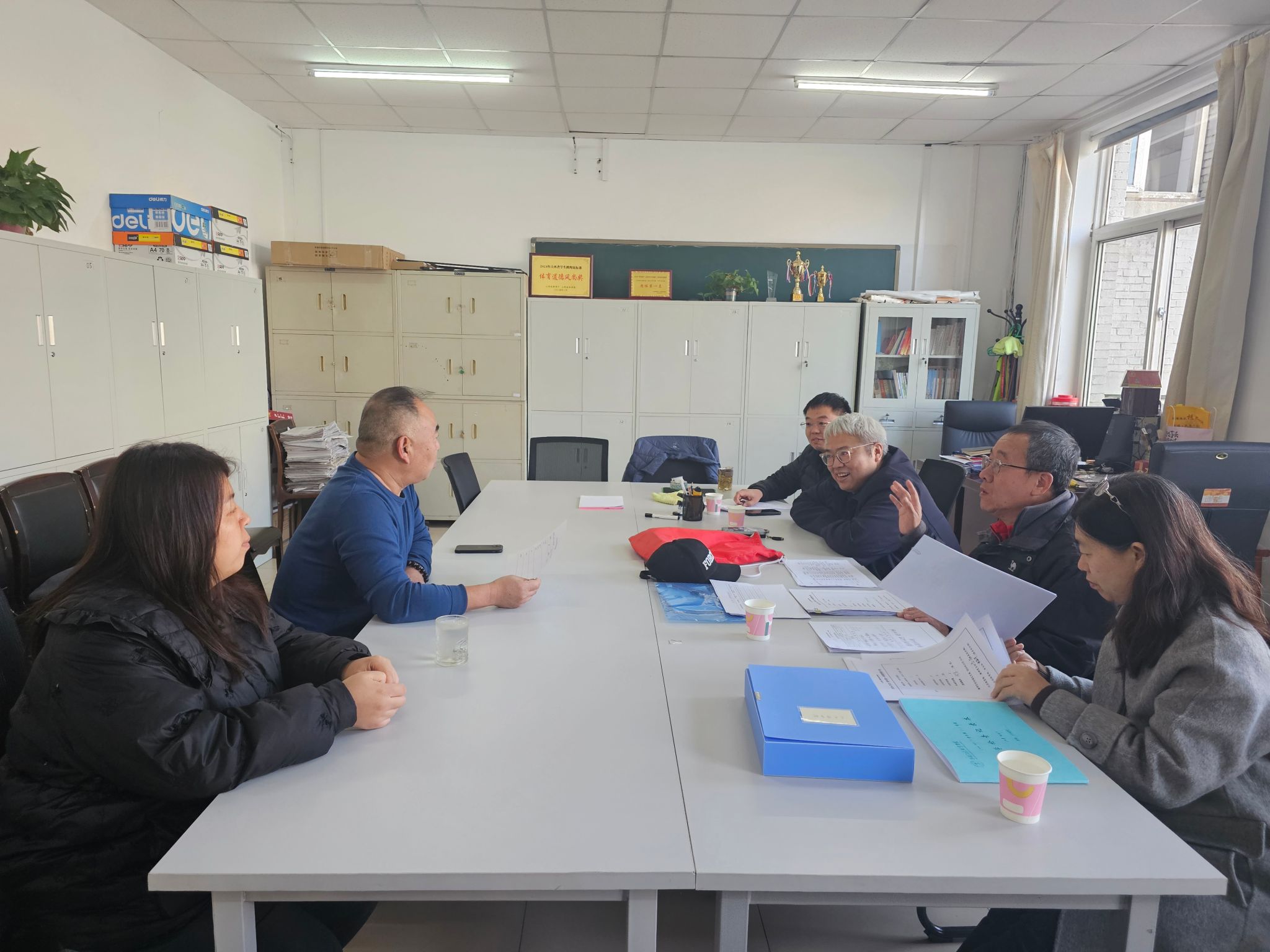 督导组查阅了公共体育部督导工作材料,听取了督导工作汇报。组长李斌云对公共体育部教学督导工作给予了肯定,并高度评价李春冉和崔红霞两位老师。他指出,两位老师认真负责,课堂组织有序,讲解条理清晰,同时课堂互动良好,能充分激发和调动学生的学习积极性。此后,督导组就如何更好的发挥督导在教学中的促进作用以及极端天气如何上好体育课进行了探讨。
