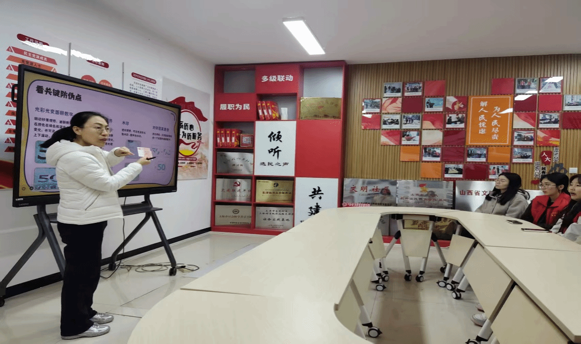 活动由教师支部党员李梦媛老师主讲,她以“实用技能传授”为重点,通过实物演示直观讲解人民币水印、安全线等核心防伪特征,结合农贸市场、小商店等日常交易案例,教居民快速识别假币;同时明确“遇假币先沟通、拒更换即报警、绝不二次流通”的处理流程,避免群众因不当操作受损。针对老年群体易遇的诈骗风险,李老师拆解电话诈骗、网络诈骗、保健品诈骗等常见套路,提炼“不轻信、不透露、不转账”防骗“三不”原则,并特别建议老年人遇可疑情况及时联系子女、社区或警方,切勿独自应对。