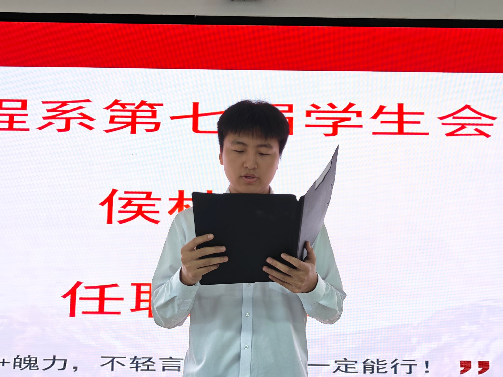 大会在庄严的国歌声中拉开帷幕,会议流程紧凑有序。第一项由主持人庄重宣读到会领导名单;第二项,信息工程系党总支副书记张伟丽为全体学生会干部致辞,首先她对第六届学生干部致以最衷心的感谢,同时对新一届的学生会干部表示热烈的祝贺,其次,张伟丽书记对新一届的学生会干部提出几点希望:一要坚守初心,牢记服务宗旨;二要勇于担当,积极主动作为;三要注重协作,凝聚团队力量;四要平衡兼顾,做到全面发展,最后对全体学生干部提出殷切希望,希望新一届的学生干部以最饱满的热情投入工作,为系部发展贡献力量;第三项,第六届学生会主席巩宇杰、团总支副书记吴珈榕先后作工作报告,全面回顾过去一年学生会的工作成果,他们在任期间为系部学生会发展所付出的努力与取得的成绩,赢得在场师生的高度认可;第四项,信息工程系团总支书记曹文霞老师正式宣读经过层层选拔选举产生的第七届学生会干部当选名单;第五项,新当选的第七届学生会主席侯林涛、团总支副书记曹梦杰发表任职发言,二人郑重承诺将以高度责任感履行职责,严格遵守工作纪律,带领信息工程系学生会迈向新征程。