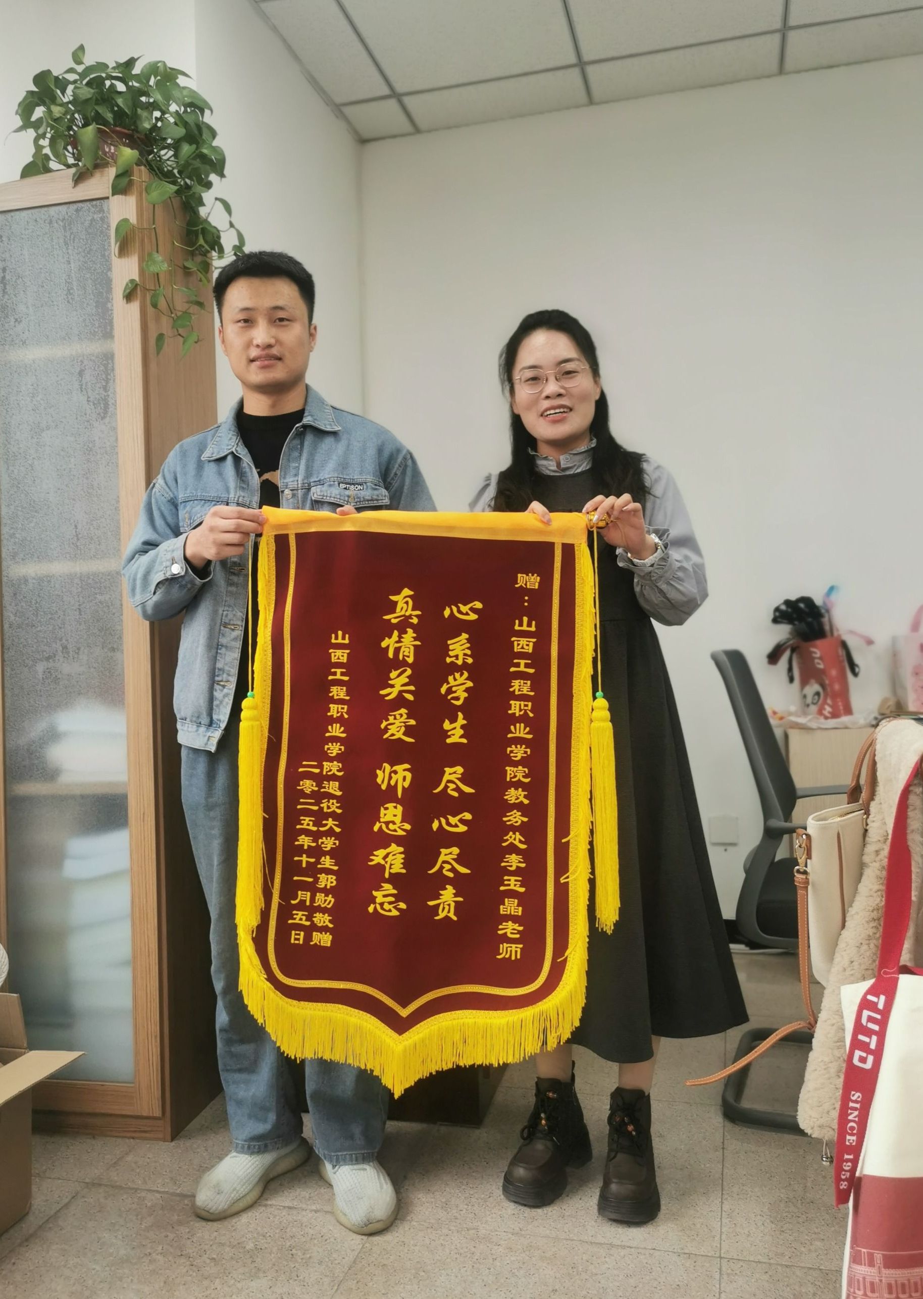 11月5日,我院教务部与学生工作部办公室迎来特殊访客——2025级新生郭勋。他手持锦旗,向老师们表达真挚谢意,这份心意既是对学院工作的肯定,更彰显了学院各部门协同服务的责任与温度。
