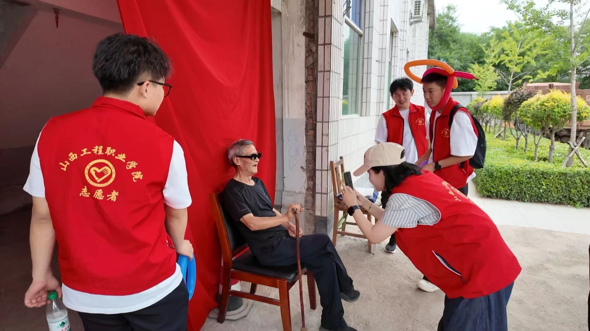 下午,同学们在村委会拉起红色幕布,准备好拍摄道具,为村民免费拍照,同学们运用摄影技巧和创意构思,为村里的爷爷奶奶们拍下了一张张活力十足、紧跟潮流的趣味照片。考虑到让村民们尽快得到照片,我们用便携式照片打印机将照片打印出来送给村民。当我们洗完照片,送交给村民们时,他们拿起相片,缓缓抚摸,眸中透着幸福。此刻,青春与皱纹的碰撞使得三下乡的意义具象化了。