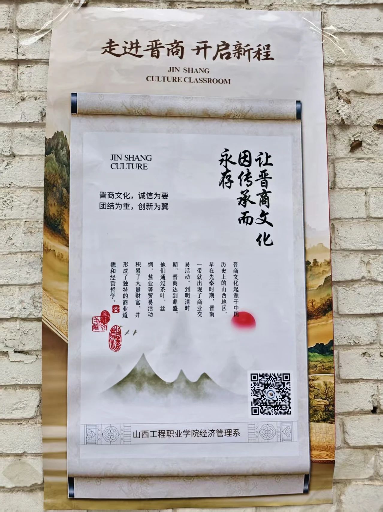 活动现场,团队师生以生动的语言和丰富的案例,深入浅出地为村民们讲述了晋商的发展历程、经营之道与文化内涵。从明清时期晋商票号“汇通天下”的辉煌成就,到“诚实守信、开拓进取、和衷共济、务实经营、经世济民”的晋商精神内核,团队成员用通俗易懂的方式深入剖析晋商如何以“义利并重”的理念成就商业传奇。经济管理系团总支书记加亚杰结合宁家营村产业发展现状,分享晋商“抱团发展”“以商养农”等理念,鼓励村民借鉴晋商成功经验,探索乡村产业融合新路径。实践团以“晋商薪火,经英领航”团建品牌为载体,通过图文展板、视频展播与成果汇报,全方位展示品牌“传承晋商文化、培育实践人才”的建设成果。成员们分享品牌开展的调研服务、非遗传承等特色活动,彰显经管学子将晋商精神转化为服务社会的行动自觉。